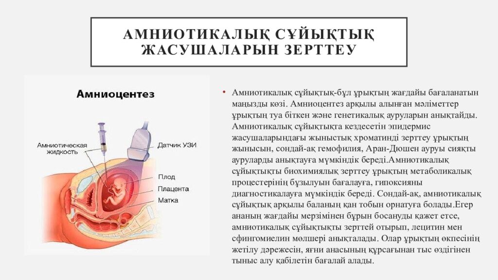 Амниотикалық сұйықтық-бұл ұрықтың жағдайы бағаланатын маңызды көзі. Амниоцентез арқылы алынған мәліметтер ұрықтың туа біткен және генетикалық ауруларын анықтайды. Амниотикалық сұйықтықта кездесетін эпидермис жасушаларындағы жыныстық хроматинді зерттеу ұрықтың жынысын, сондай-ақ гемофилия, Аран-Дюшен ауруы сияқты ауруларды анықтауға мүмкіндік береді.Амниотикалық сұйықтықты биохимиялық зерттеу ұрықтың метаболикалық процестерінің бұзылуын бағалауға, гипоксияны диагностикалауға мүмкіндік береді. Сондай-ақ, амниотикалық сұйықтық арқылы баланың қан тобын орнатуға болады.Егер ананың жағдайы мерзімінен бұрын босануды қажет етсе, амниотикалық сұйықтықты зерттей отырып, лецитин мен сфингомиелин мөлшері анықталады. Олар ұрықтың өкпесінің жетілу дәрежесін, яғни анасының құрсағынан тыс өздігінен тыныс алу қабілетін бағалай алады.
