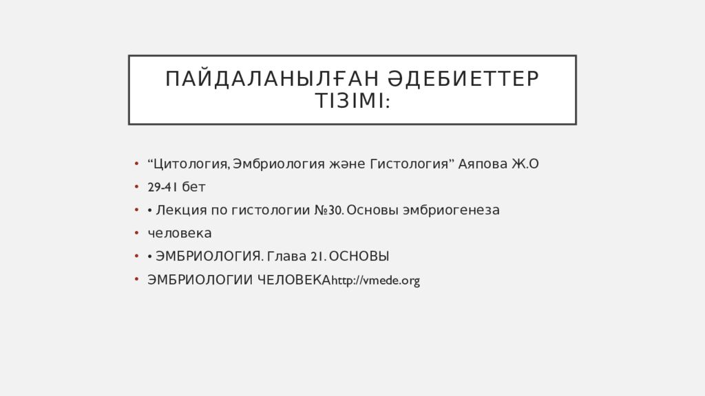 “Цитология, Эмбриология және Гистология” Аяпова Ж.О 29-41 бет • Лекция по гистологии №30. Основы эмбриогенеза человека • ЭМБРИОЛОГИЯ. Глава 21. ОСНОВЫ ЭМБРИОЛОГИИ ЧЕЛОВЕКАhttp://vmede.org