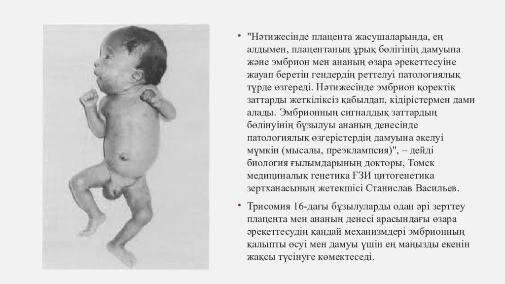 " Нәтижесінде плацента жасушаларында, ең алдымен, плацентаның ұрық бөлігінің дамуына және эмбрион мен ананың өзара әрекеттесуіне жауап беретін гендердің реттелуі патологиялық түрде өзгереді. Нәтижесінде эмбрион қоректік заттарды жеткіліксіз қабылдап, кідірістермен дами алады. Эмбрионның сигналдық заттардың бөлінуінің бұзылуы ананың денесінде патологиялық өзгерістердің дамуына әкелуі мүмкін ( мысалы, преэклампсия )", – дейді биология ғылымдарының докторы, Томск медициналық генетика ҒЗИ цитогенетика зертханасының жетекшісі Станислав Васильев. Трисомия 16-дағы бұзылуларды одан әрі зерттеу плацента мен ананың денесі арасындағы өзара әрекеттесудің қандай механизмдері эмбрионның қалыпты өсуі мен дамуы үшін ең маңызды екенін жақсы түсінуге көмектеседі.
