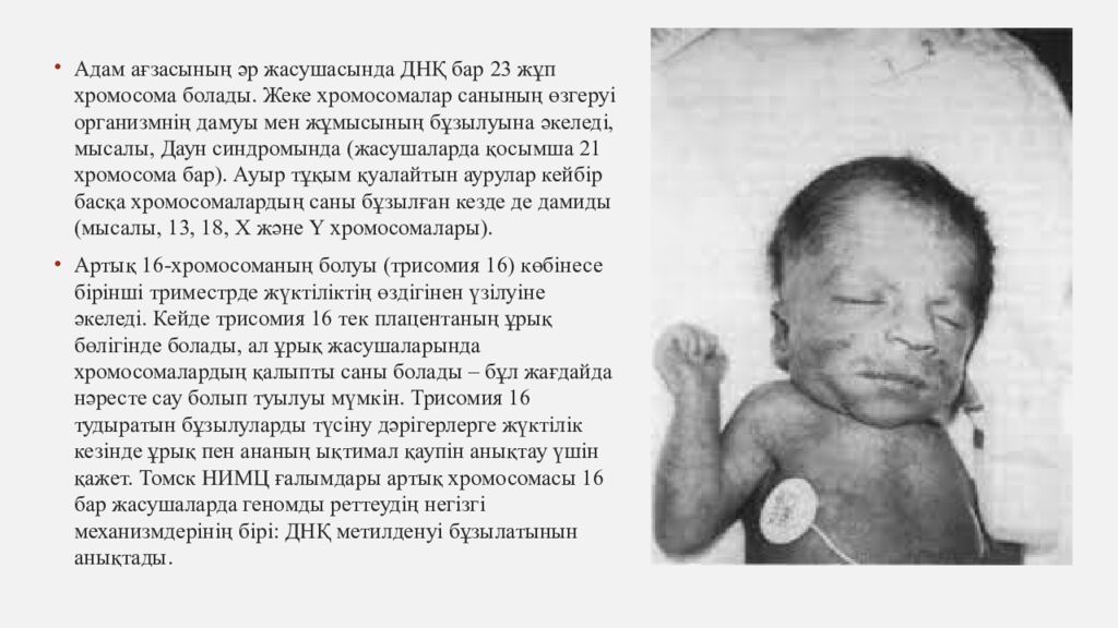 Адам ағзасының әр жасушасында ДНҚ бар 23 жұп хромосома болады. Жеке хромосомалар санының өзгеруі организмнің дамуы мен жұмысының бұзылуына әкеледі, мысалы, Даун синдромында ( жасушаларда қосымша 21 хромосома бар). Ауыр тұқым қуалайтын аурулар кейбір басқа хромосомалардың саны бұзылған кезде де дамиды ( мысалы, 13, 18, X және Y хромосомалары ). Артық 16-хромосоманың болуы ( трисомия 16) көбінесе бірінші триместрде жүктіліктің өздігінен үзілуіне әкеледі. Кейде трисомия 16 тек плацентаның ұрық бөлігінде болады, ал ұрық жасушаларында хромосомалардың қалыпты саны болады – бұл жағдайда нәресте сау болып туылуы мүмкін. Трисомия 16 тудыратын бұзылуларды түсіну дәрігерлерге жүктілік кезінде ұрық пен ананың ықтимал қаупін анықтау үшін қажет. Томск НИМЦ ғалымдары артық хромосомасы 16 бар жасушаларда геномды реттеудің негізгі механизмдерінің бірі : ДНҚ метилденуі бұзылатынын анықтады.