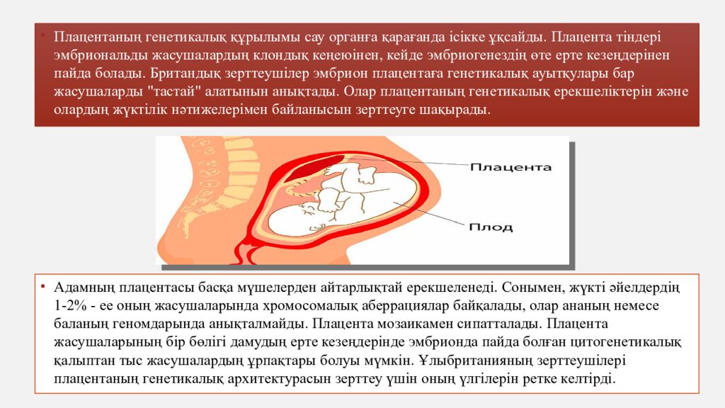 Плацентаның генетикалық құрылымы сау органға қарағанда ісікке ұқсайды. Плацента тіндері эмбриональды жасушалардың клондық кеңеюінен, кейде эмбриогенездің өте ерте кезеңдерінен пайда болады. Британдық зерттеушілер эмбрион плацентаға генетикалық ауытқулары бар жасушаларды " тастай " алатынын анықтады. Олар плацентаның генетикалық ерекшеліктерін және олардың жүктілік нәтижелерімен байланысын зерттеуге шақырады. Адамның плацентасы басқа мүшелерден айтарлықтай ерекшеленеді. Сонымен, жүкті әйелдердің 1-2% - ее оның жасушаларында хромосомалық аберрациялар байқалады, олар ананың немесе баланың геномдарында анықталмайды. Плацента мозаикамен сипатталады. Плацента жасушаларының бір бөлігі дамудың ерте кезеңдерінде эмбрионда пайда болған цитогенетикалық қалыптан тыс жасушалардың ұрпақтары болуы мүмкін. Ұлыбританияның зерттеушілері плацентаның генетикалық архитектурасын зерттеу үшін оның үлгілерін ретке келтірді.