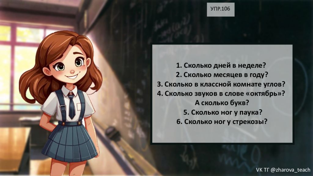 УПР.106 1. Сколько дней в неделе? 2. Сколько месяцев в году? 3. Сколько в классной комнате углов? 4. Сколько звуков в слове «октябрь»? А сколько букв? 5. Сколько ног у паука? 6. Сколько ног у стрекозы? VK ТГ @zharova _ teach