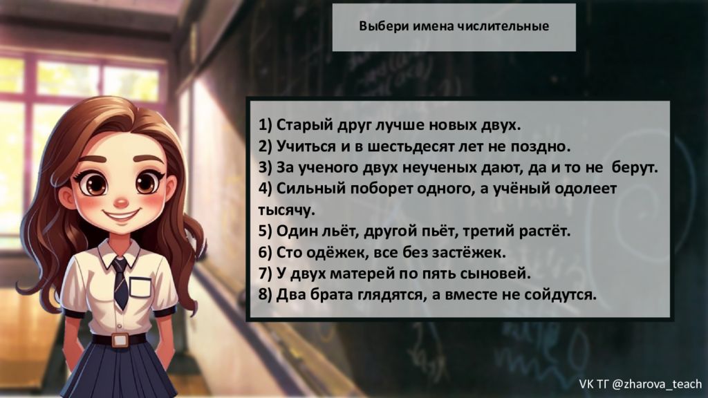 Выбери имена числительные 1) Старый друг лучше новых двух. 2) Учиться и в шестьдесят лет не поздно. 3) За ученого двух неученых дают, да и то не берут. 4) Сильный поборет одного, а учёный одолеет тысячу. 5) Один льёт, другой пьёт, третий растёт. 6) Сто одёжек, все без застёжек. 7) У двух матерей по пять сыновей. 8) Два брата глядятся, а вместе не сойдутся. VK ТГ @zharova _ teach