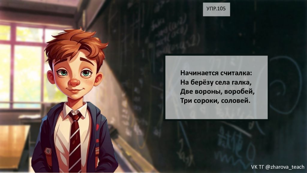 УПР.105 Начинается считалка: На берёзу села галка, Две вороны, воробей, Три сороки, соловей. VK ТГ @zharova _ teach