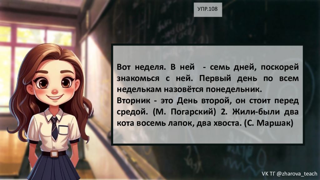 УПР.108 Вот неделя. В ней - семь дней, поскорей знакомься с ней. Первый день по всем неделькам назовётся понедельник. Вторник - это День второй, он стоит перед средой. (М. Погарский) 2. Жили-были два кота восемь лапок, два хвоста. (С. Маршак) VK ТГ @zharova _ teach