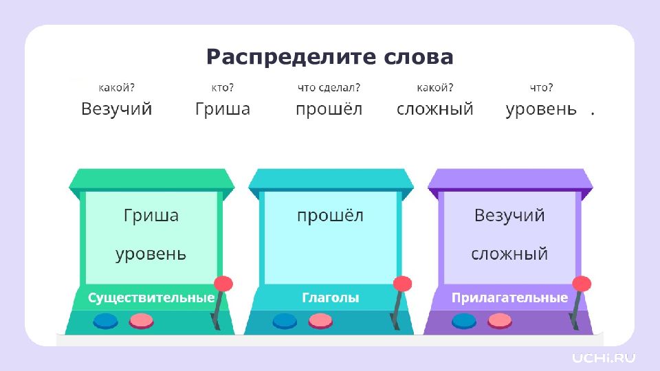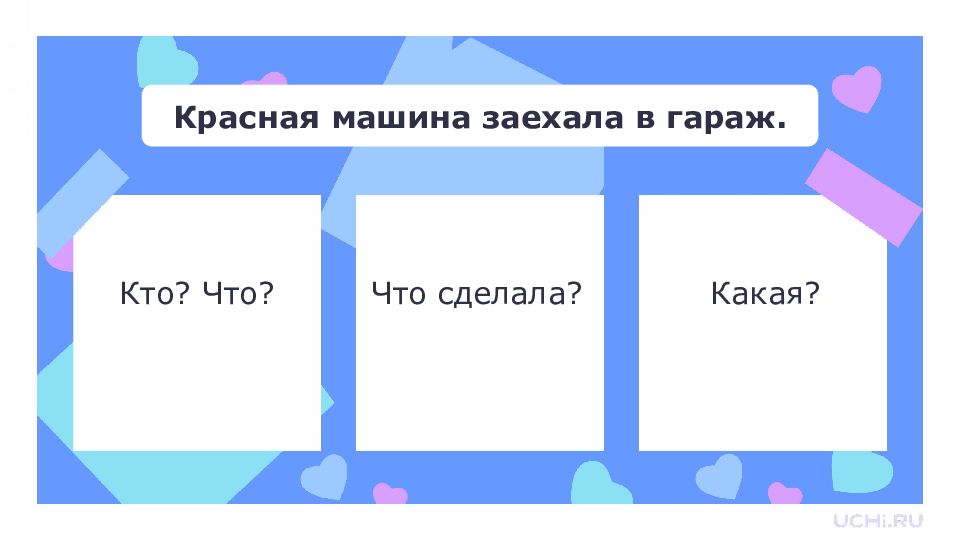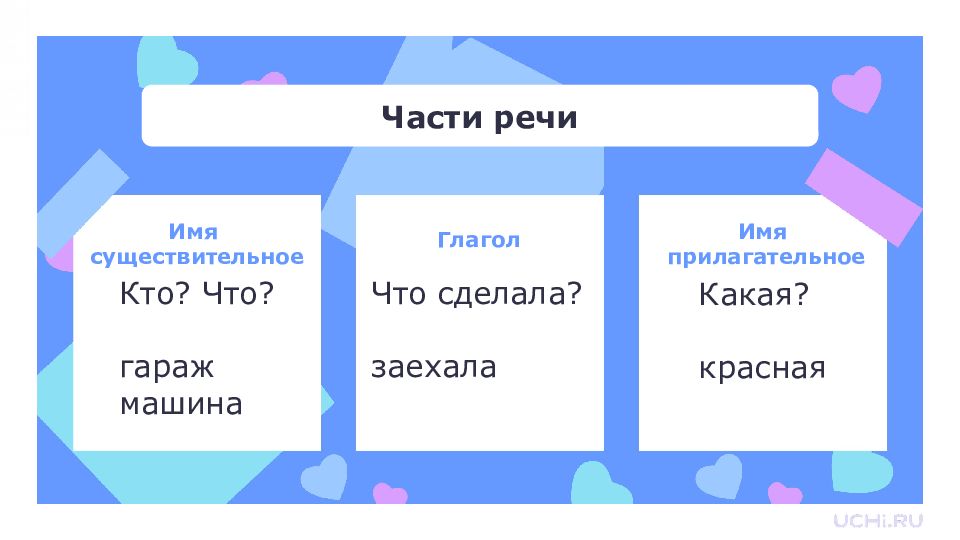 Части речи Кто? Что? гараж машина Что сделала? заехала Какая? красная Имя существительное Глагол Имя прилагательное