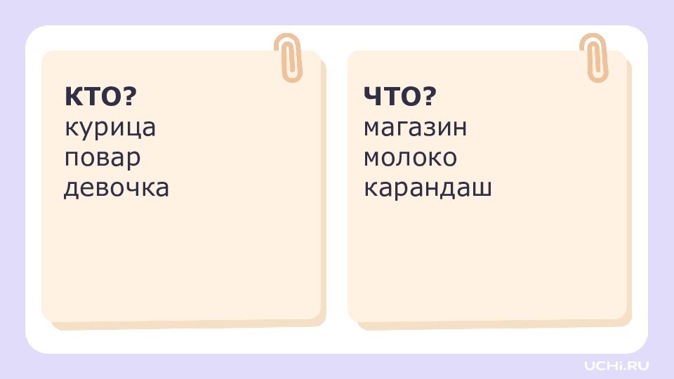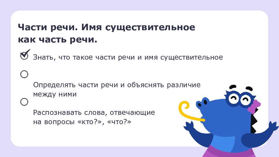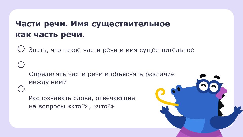 Части речи. Имя существительное как часть речи. Знать, что такое части речи и имя существительное Определять части речи и объяснять различие между ними Распознавать слова, отвечающие на вопросы «кто?», «что?»