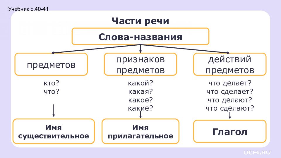 Части речи Слова-названия признаков предметов действий предметов предметов кто? что? какой? какая? какое? какие? что делает? что сделает? что делают? что сделают? Глагол Имя прилагательное Имя существительное Учебник с.40-41