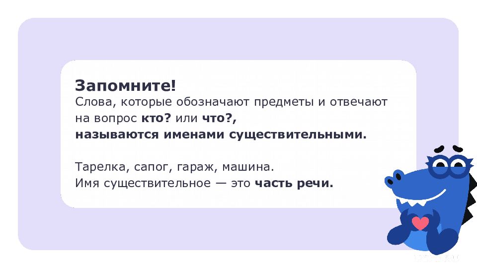 Запомните! Слова, которые обозначают предметы и отвечают на вопрос кто? или что?, называются именами существительными. Тарелка, сапог, гараж, машина. Имя существительное — это часть речи.