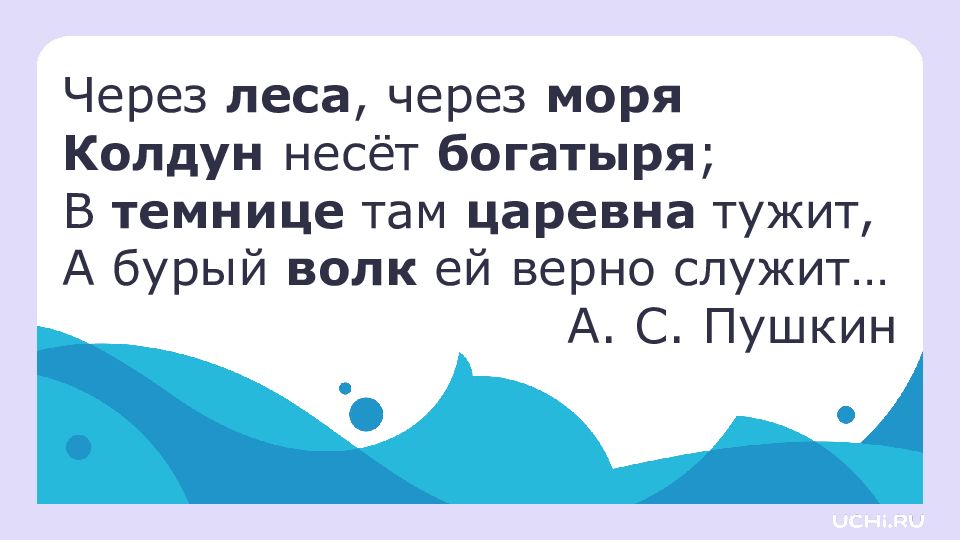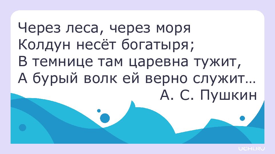 Через леса, через моря Колдун несёт богатыря ; В темнице там царевна тужит, А бурый волк ей верно служит… А. С. Пушкин