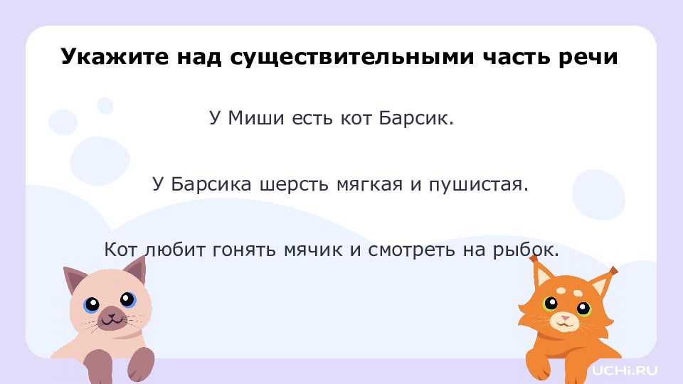 У Барсика шерсть мягкая и пушистая. К от любит гонять мячик и смотреть на рыбок. У Миши есть кот Барсик. Укажите над существительными часть речи