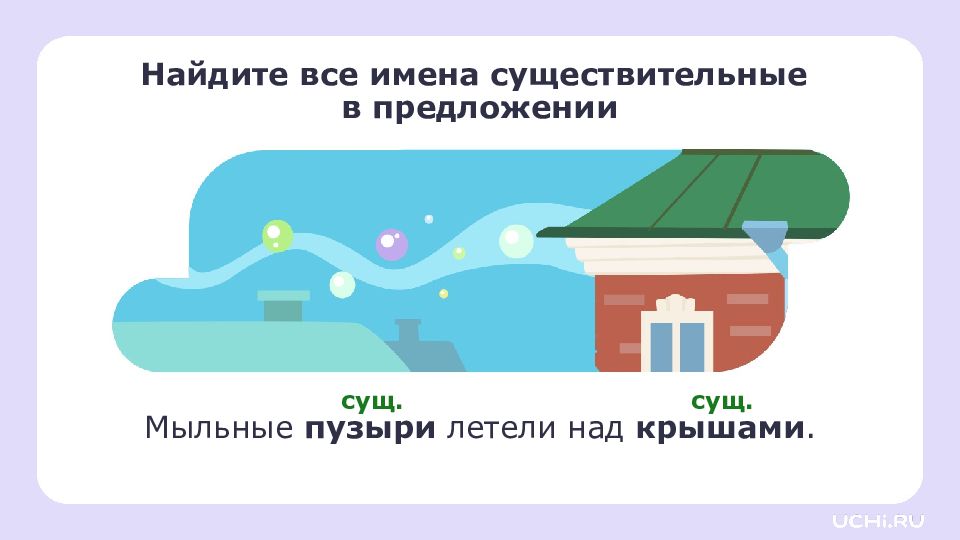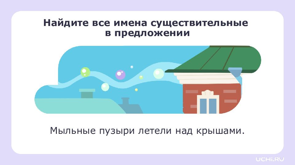 Слайд 14: Найдите все имена существительные в предложении Мыльные пузыри летели над крышами