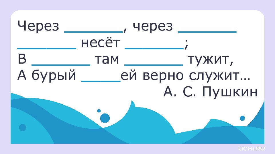 Через ______, через ______ ______ несёт ______ ; В ______ там ______ тужит, А бурый ____ ей верно служит… А. С. Пушкин