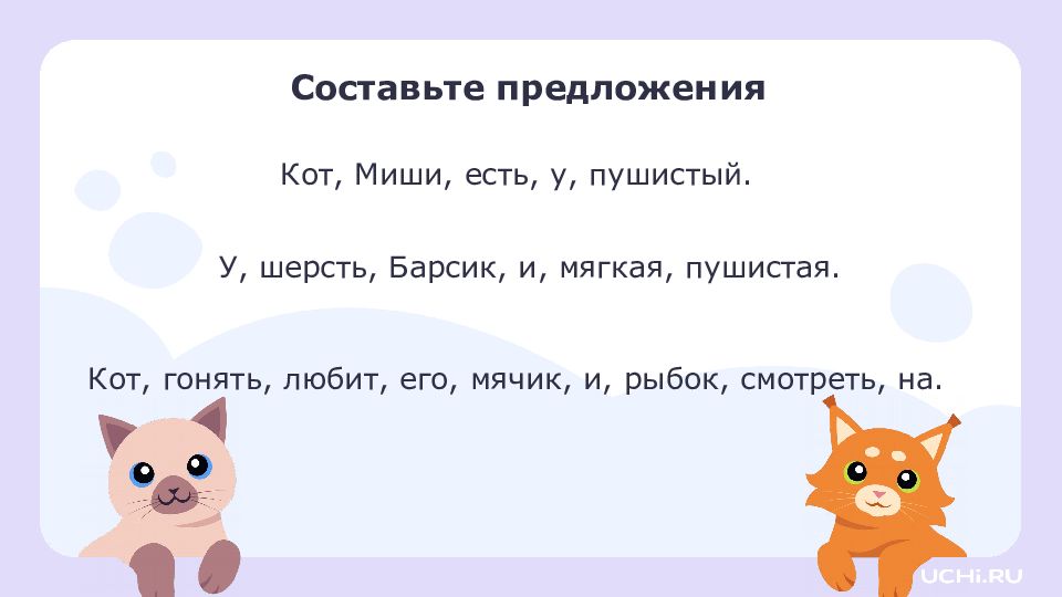 У, шерсть, Барсик, и, мягкая, пушистая. Кот, гонять, любит, его, мячик, и, рыбок, смотреть, на. Кот, Миши, есть, у, пушистый. Составьте предложения