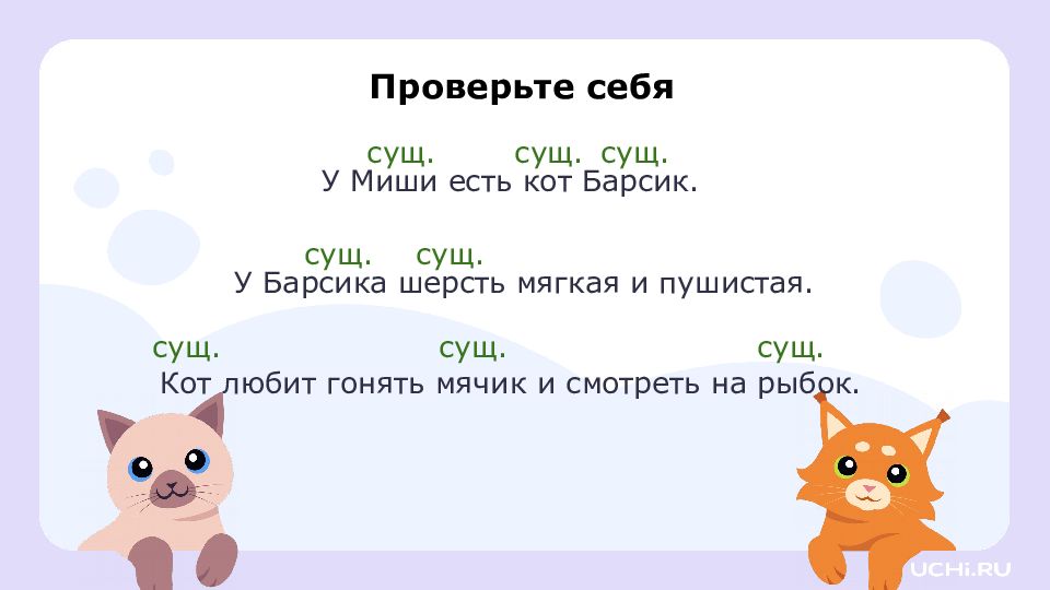 У Барсика шерсть мягкая и пушистая. К от любит гонять мячик и смотреть на рыбок. У Миши есть кот Барсик. Проверьте себя сущ. сущ. сущ. сущ. сущ. сущ. сущ. сущ.