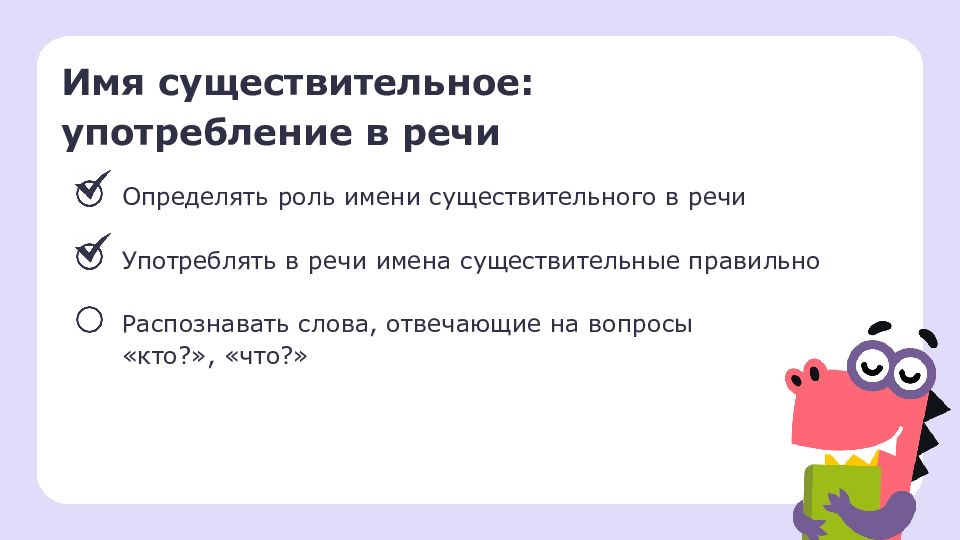 Имя существительное: употребление в речи Определять роль имени существительного в речи Употреблять в речи имена существительные правильно Распознавать слова, отвечающие на вопросы «кто?», «что?»