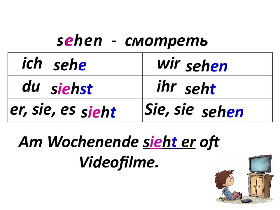 ich wir du ihr er, sie, es Sie, sie sehen - смотреть seh e s ie h st s ie h t seh en seh t seh en e Am Wochenende s ie h t er oft Videofilme.
