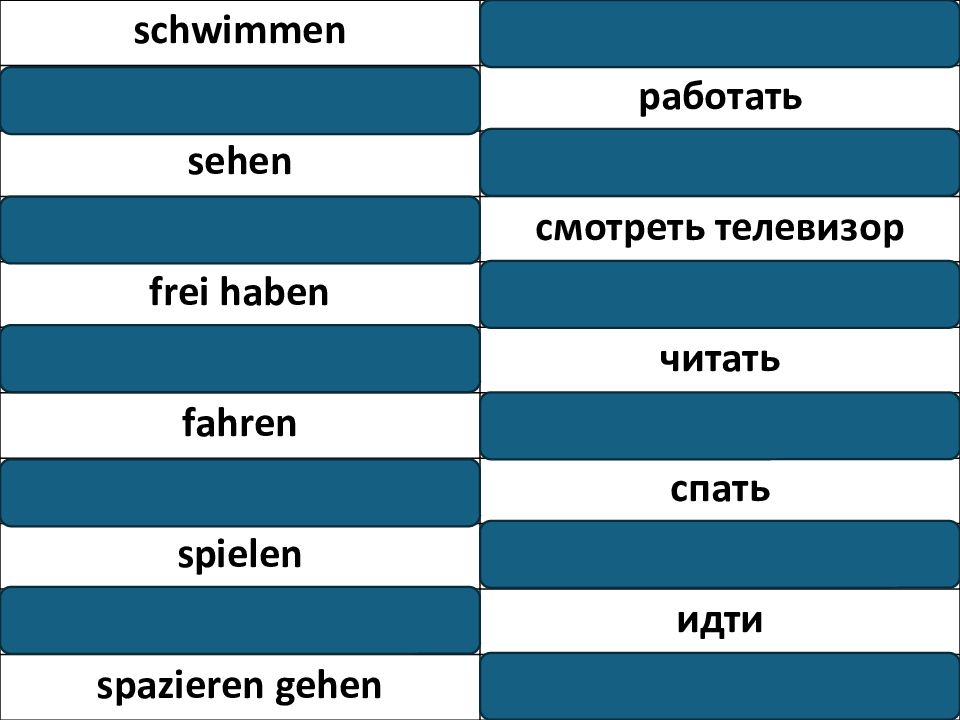 schwimmen плавать arbeiten работать sehen видеть, смотреть fernsehen смотреть телевизор frei haben быть свободным lesen читать fahren ехать schlafen спать spielen играть gehen идти spazieren gehen гулять