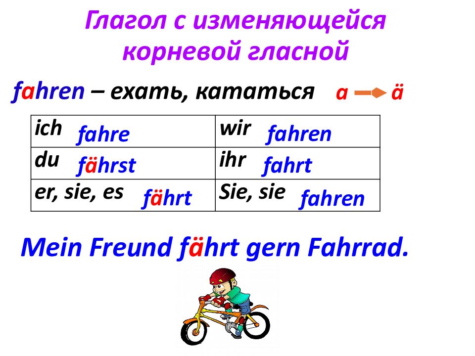 ich wir du ihr er, sie, es Sie, sie Глагол с изменяющейся корневой гласной f a hren – ехать, кататься fahre Mein Freund f ä hrt gern Fahrrad. f ä hrst f ä hrt fahren fahrt fahren a ä