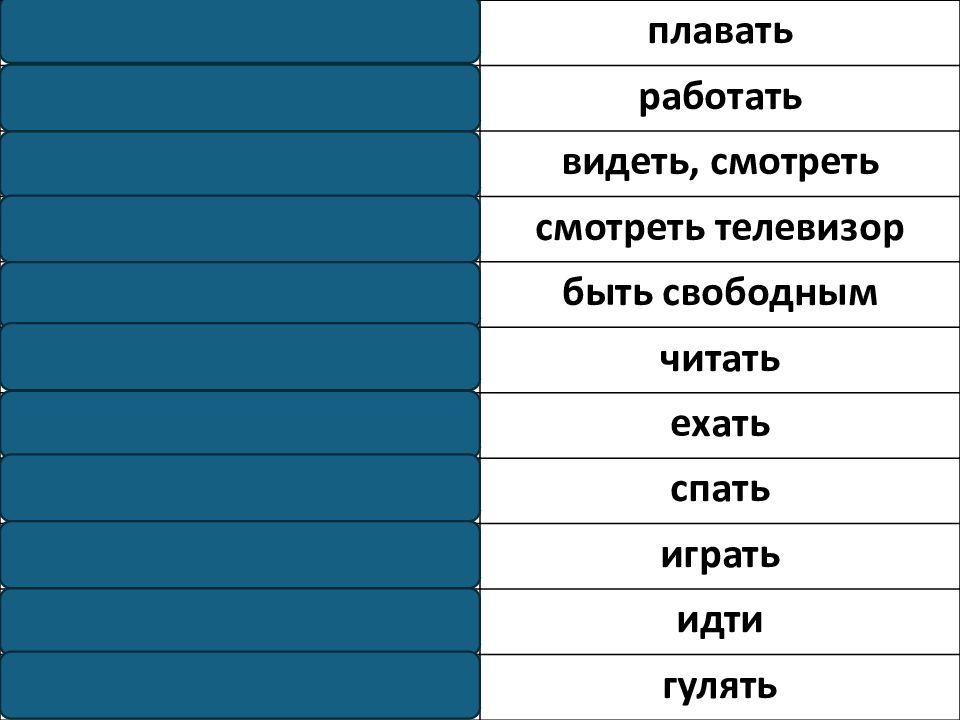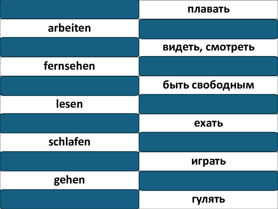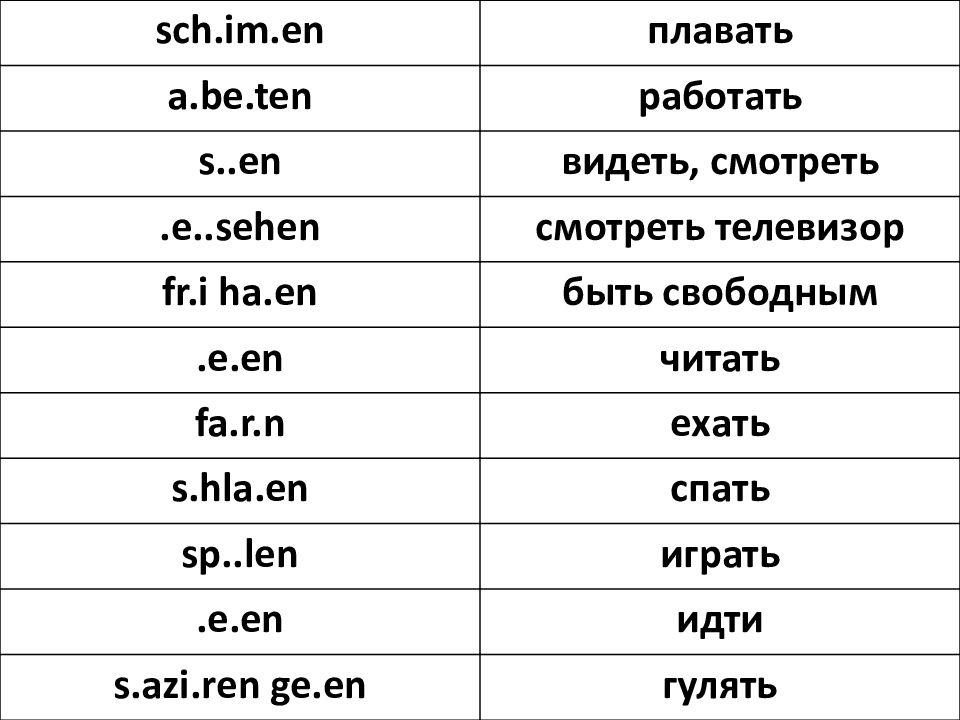 sch.im.en плавать a.be.ten работать s..en видеть, смотреть .e.. sehen смотреть телевизор fr.i ha.en быть свободным . e.en читать fa.r.n ехать s.hla.en спать sp.. len играть . e.en идти s.azi.ren ge.en гулять