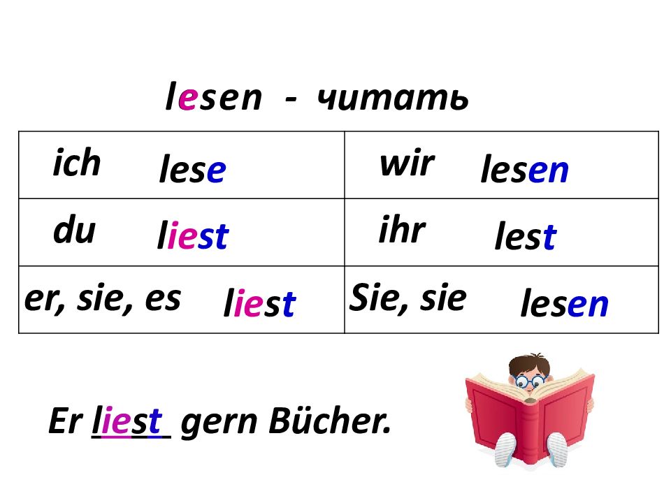ich wir du ihr er, sie, es Sie, sie lesen - читать les e l ie st l ie s t les en les t les en e Er l ie s t gern Bücher.
