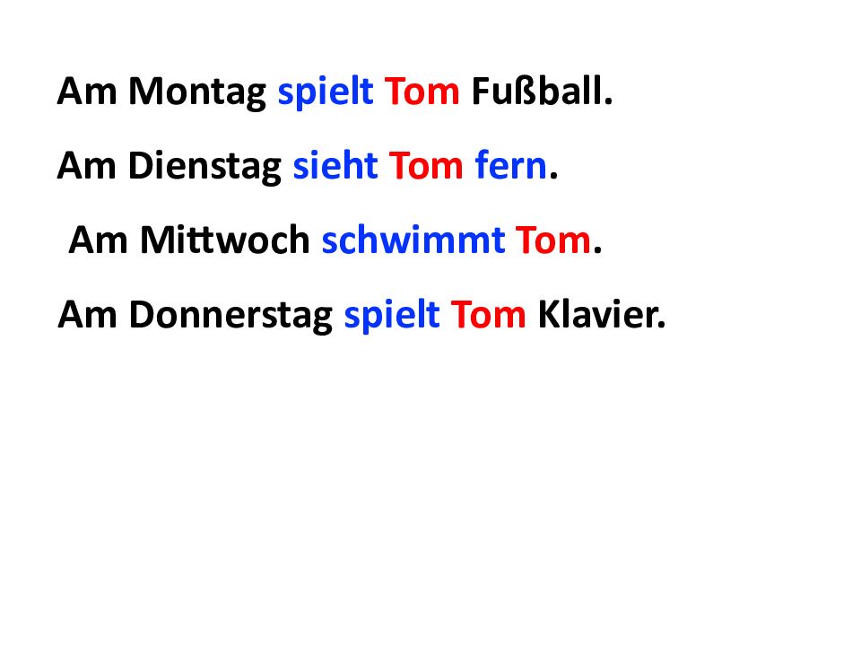 Am Montag spielt Tom Fußball. Am Dienstag sieht Tom fern. Am Mittwoch schwimmt Tom. Am Donnerstag spielt Tom Klavier.