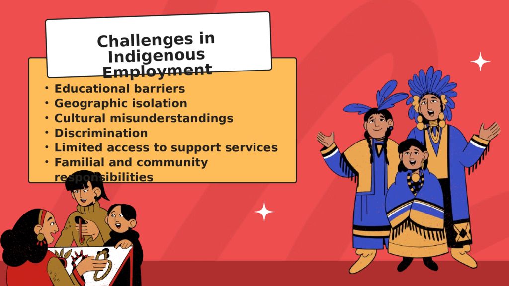Educational barriers Geographic isolation Cultural misunderstandings Discrimination Limited access to support services Familial and community responsibilities Challenges in Indigenous Employment
