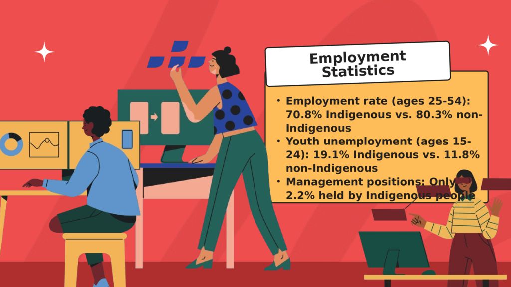 Employment Statistics Employment rate (ages 25-54): 70.8% Indigenous vs. 80.3% non-Indigenous Youth unemployment (ages 15-24): 19.1% Indigenous vs. 11.8% non-Indigenous Management positions: Only 2.2% held by Indigenous people