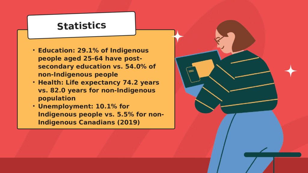 Education: 29.1% of Indigenous people aged 25-64 have post-secondary education vs. 54.0% of non-Indigenous people Health: Life expectancy 74.2 years vs. 82.0 years for non-Indigenous population Unemployment: 10.1% for Indigenous people vs. 5.5% for non-Indigenous Canadians (2019) Statistics