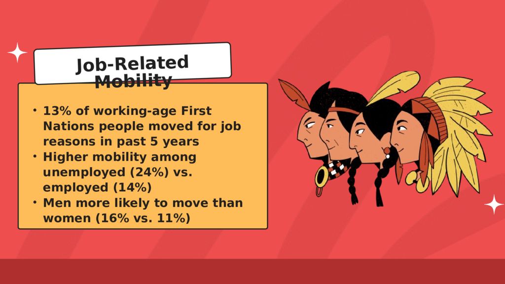 13% of working-age First Nations people moved for job reasons in past 5 years Higher mobility among unemployed (24%) vs. employed (14%) Men more likely to move than women (16% vs. 11%) Job-Related Mobility