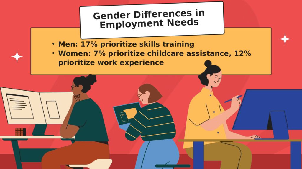 Men: 17% prioritize skills training Women: 7% prioritize childcare assistance, 12% prioritize work experience Gender Differences in Employment Needs