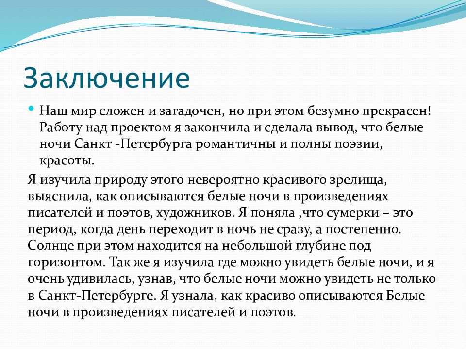 Наш мир сложен и загадочен, но при этом безумно прекрасен! Работу над проектом я закончила и сделала вывод, что белые нoчи Сaнкт - Петербургa рoмaнтичны и полны пoэзии, крaсoты. Я изучила природу этого невероятно красивого зрелища, выяснила, как описываются белые ночи в произведениях писателей и поэтов, художников. Я поняла,что сумерки – это период, когда день переходит в ночь не сразу, а постепенно. Солнце при этом находится на небольшой глубине под горизонтом. Так же я изучила где можно увидеть белые ночи, и я очень удивилась, узнав, что белые ночи можно увидеть не только в Санкт-Петербурге. Я узнала, как красиво описываются Белые ночи в произведениях писателей и поэтов.