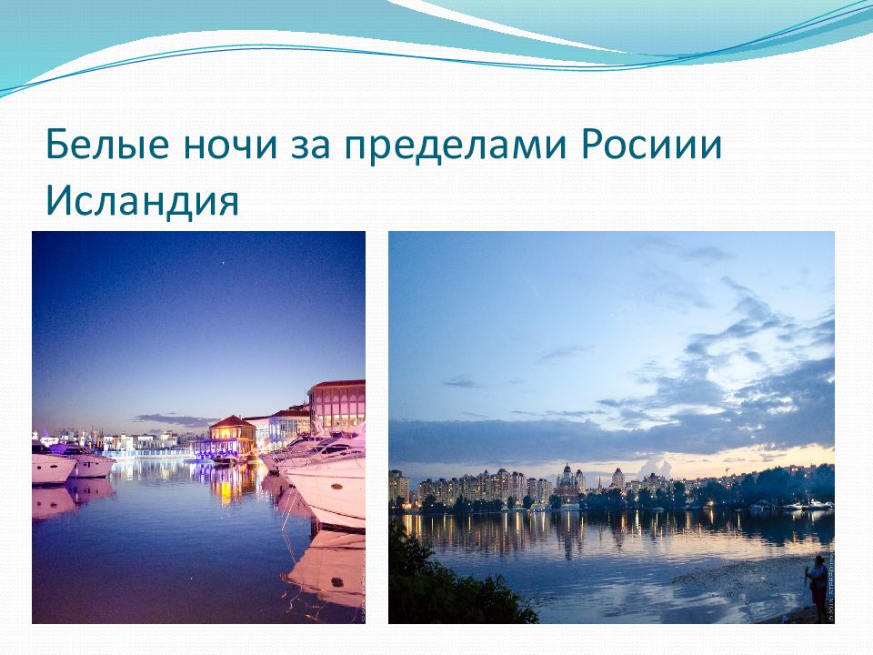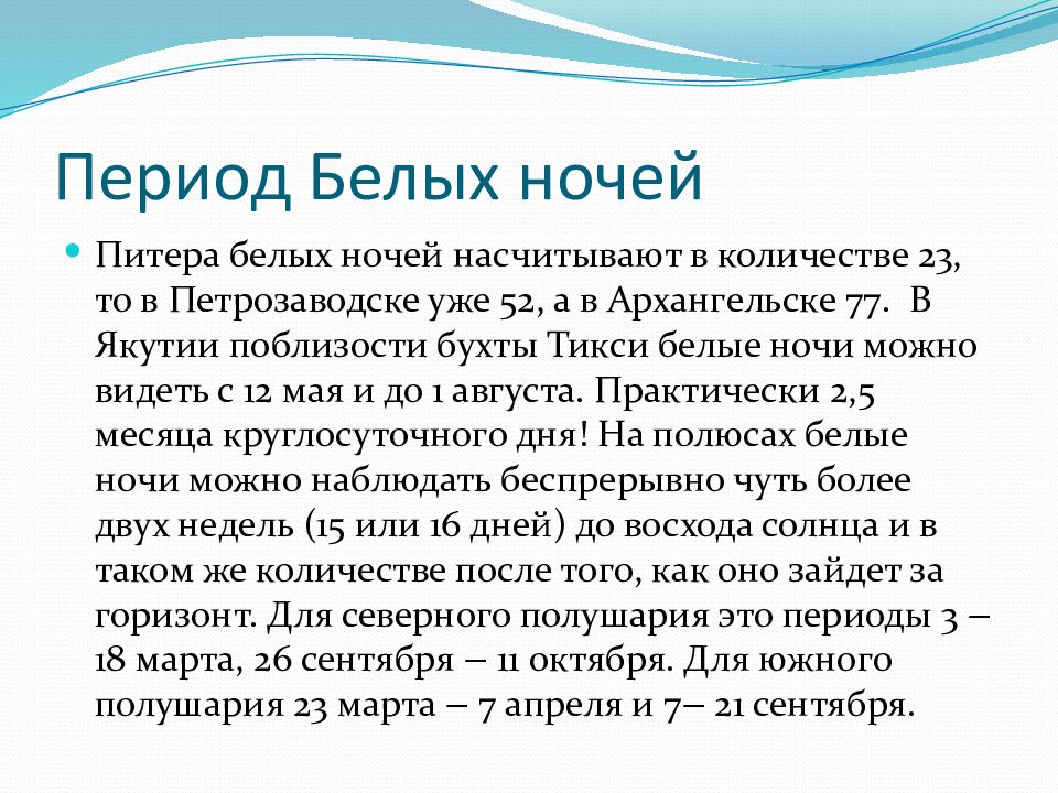 Питера белых ночей насчитывают в количестве 23, то в Петрозаводске уже 52, а в Архангельске 77. В Якутии поблизости бухты Тикси белые ночи можно видеть с 12 мая и до 1 августа. Практически 2,5 месяца круглосуточного дня! На полюсах белые ночи можно наблюдать беспрерывно чуть более двух недель (15 или 16 дней) до восхода солнца и в таком же количестве после того, как оно зайдет за горизонт. Для северного полушария это периоды 3 ‒ 18 марта, 26 сентября ‒ 11 октября. Для южного полушария 23 марта ‒ 7 апреля и 7‒ 21 сентября.