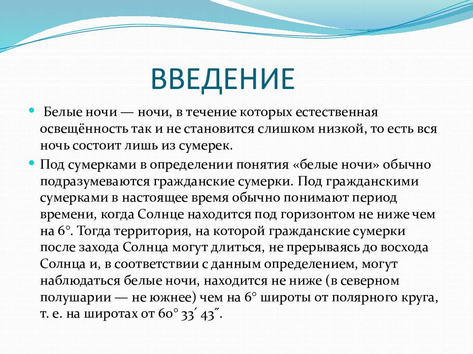 Белые ночи — ночи, в течение которых естественная освещённость так и не становится слишком низкой, то есть вся ночь состоит лишь из сумерек. Под сумерками в определении понятия «белые ночи» обычно подразумеваются гражданские сумерки. Под гражданскими сумерками в настоящее время обычно понимают период времени, когда Солнце находится под горизонтом не ниже чем на 6°. Тогда территория, на которой гражданские сумерки после захода Солнца могут длиться, не прерываясь до восхода Солнца и, в соответствии с данным определением, могут наблюдаться белые ночи, находится не ниже (в северном полушарии — не южнее) чем на 6° широты от полярного круга, т. е. на широтах от 60° 33′ 43″.