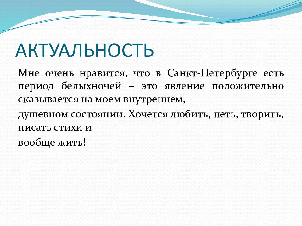 Мне очень нравится, что в Санкт-Петербурге есть период белыхночей – это явление положительно сказывается на моем внутреннем, душевном состоянии. Хочется любить, петь, творить, писать стихи и вообще жить!