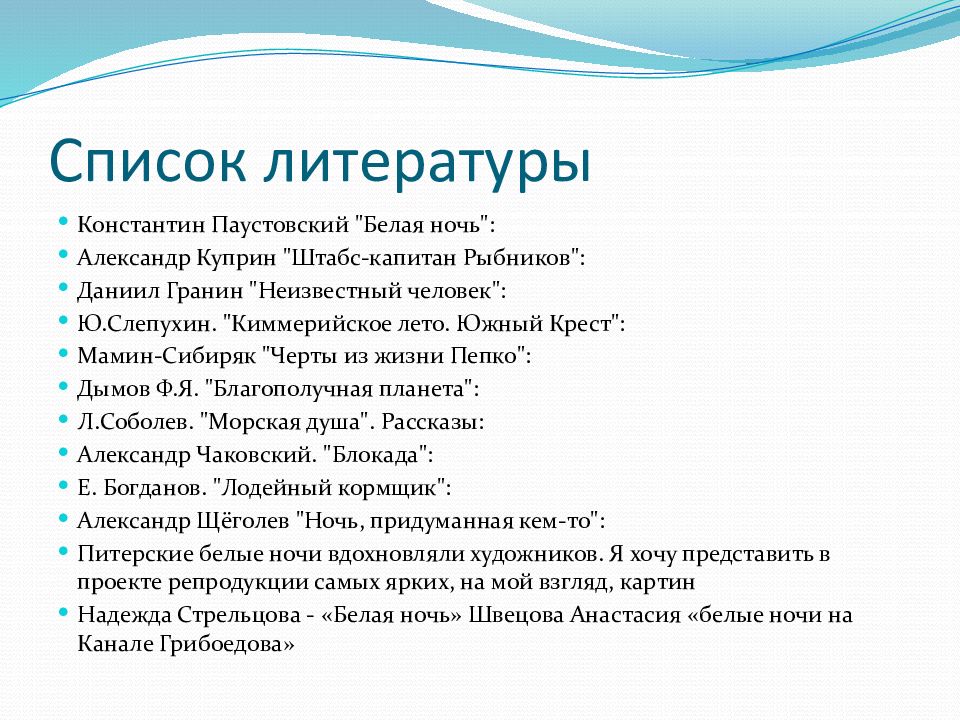 Последний слайд презентации: ИНДИВИДУАЛЬНЫЙ ПРОЕКТ «Белые ночи»-астрономическая эстетика в литературе по: Список литературы