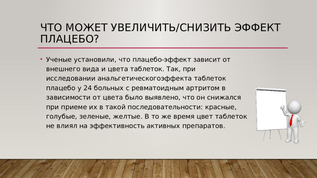 Ученые установили, что плацебо-эффект зависит от внешнего вида и цвета таблеток. Так, при исследовании анальгетическогоэффекта таблеток плацебо у 24 больных с ревматоидным артритом в зависимости от цвета было выявлено, что он снижался при приеме их в такой последовательности: красные, голубые, зеленые, желтые. В то же время цвет таблеток не влиял на эффективность активных препаратов.