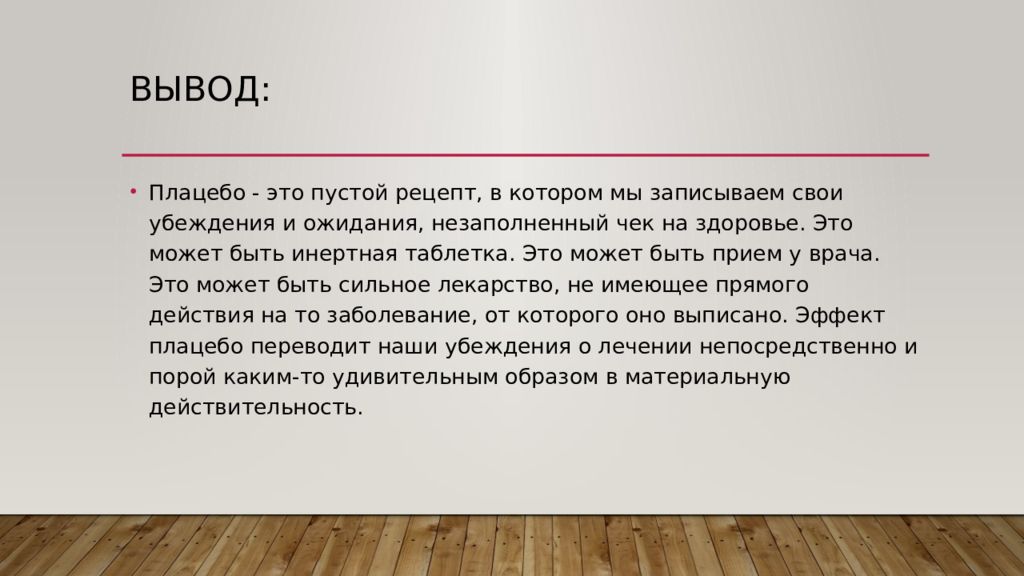Слайд 7: Воздействие плацебо на физическое и психологическое состояние человека