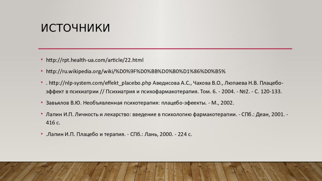 Последний слайд презентации: Индивидуальный проект на тему: эффект плацебо: Источники