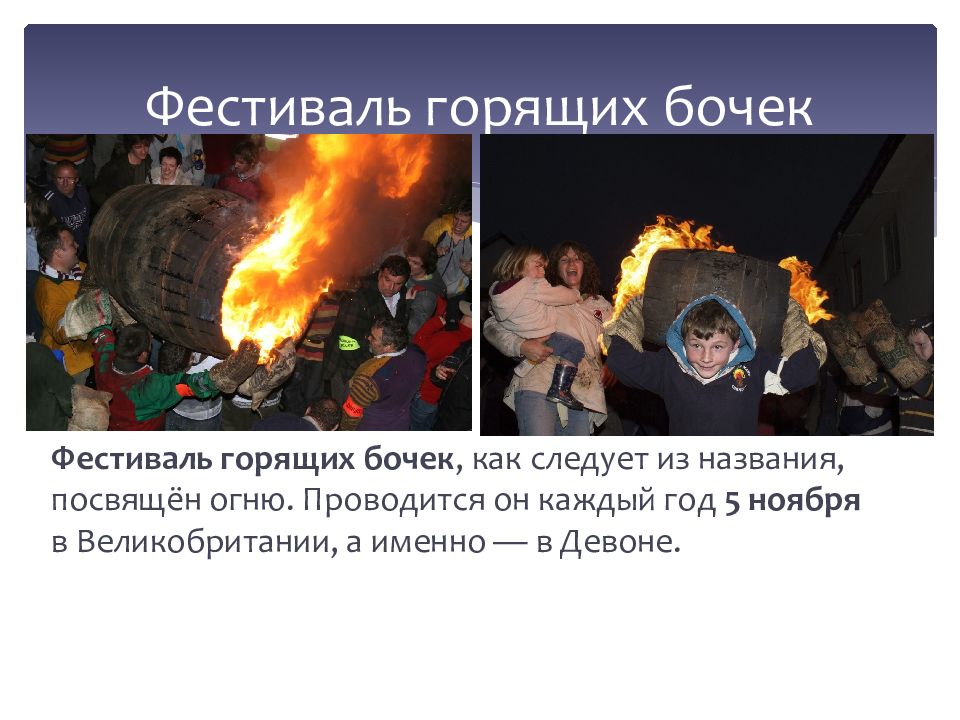 Фестиваль горящих бочек, как следует из названия, посвящён огню. Проводится он каждый год 5 ноября в Великобритании, а именно — в Девоне.