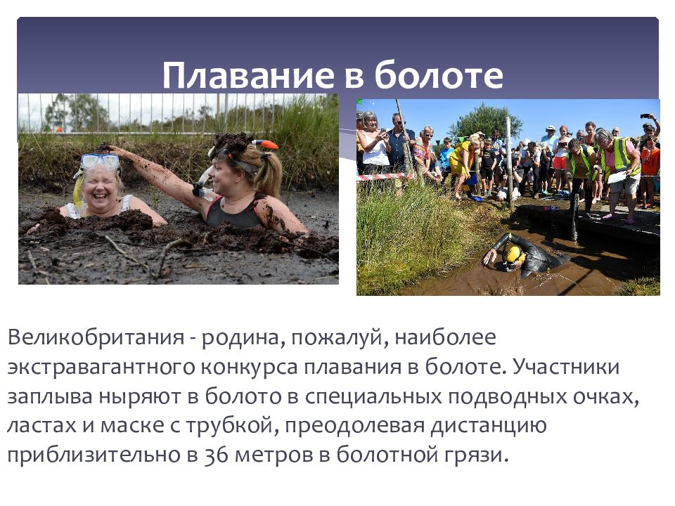 Великобритания - родина, пожалуй, наиболее экстравагантного конкурса плавания в болоте. Участники заплыва ныряют в болото в специальных подводных очках, ластах и маске с трубкой, преодолевая дистанцию приблизительно в 36 метров в болотной грязи.