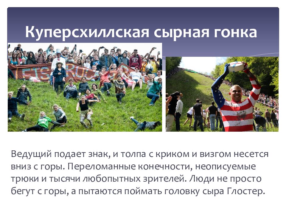Ведущий подает знак, и толпа с криком и визгом несется вниз с горы. Переломанные конечности, неописуемые трюки и тысячи любопытных зрителей. Люди не просто бегут с горы, а пытаются поймать головку сыра Глостер.