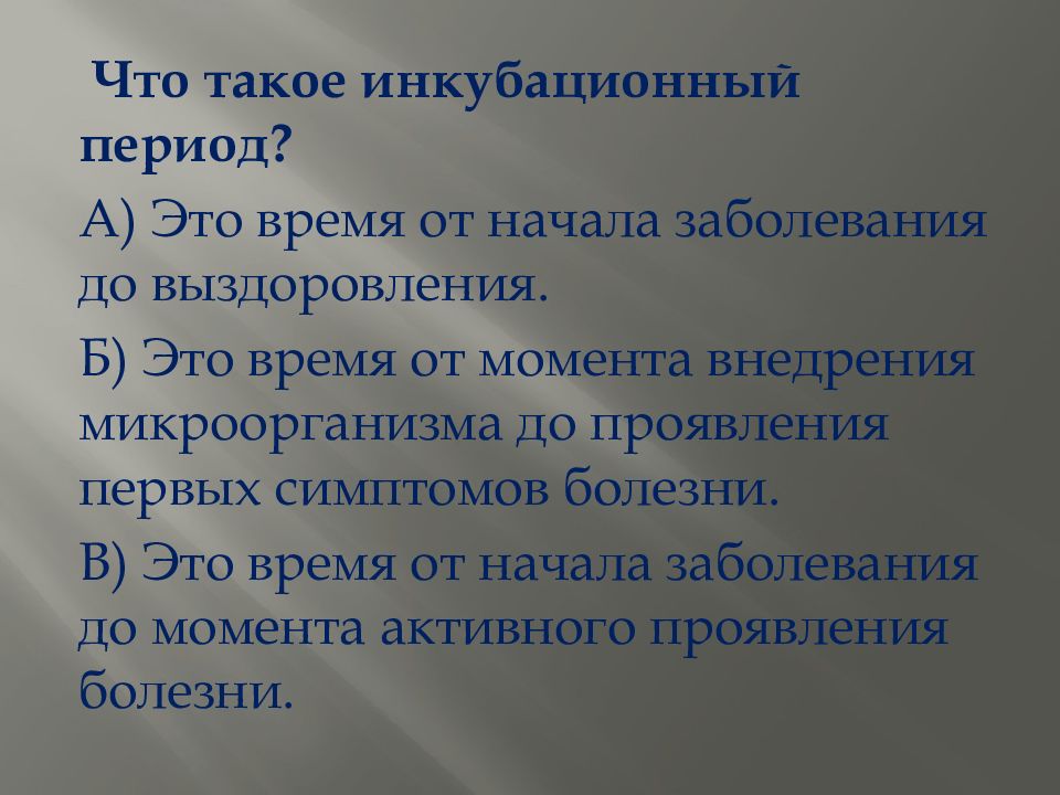 Что такое инкубационный период? А ) Это время от начала заболевания до выздоровления. Б) Это время от момента внедрения микроорганизма до проявления первых симптомов болезни. В) Это время от начала заболевания до момента активного проявления болезни.