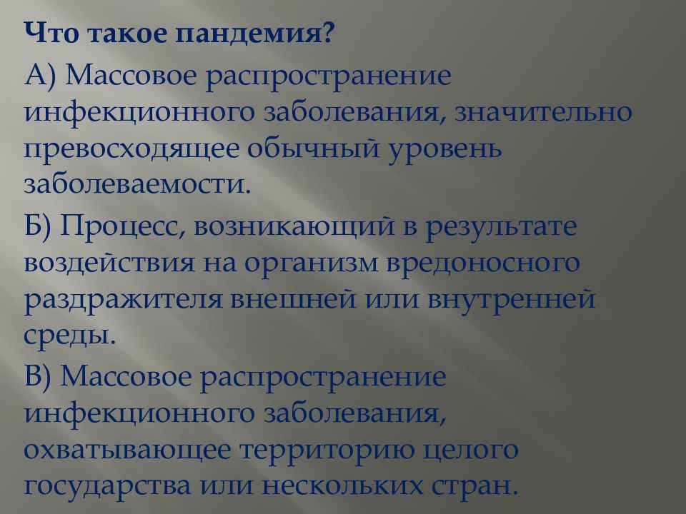 Что такое пандемия? А ) Массовое распространение инфекционного заболевания, значительно превосходящее обычный уровень заболеваемости. Б) Процесс, возникающий в результате воздействия на организм вредоносного раздражителя внешней или внутренней среды. В) Массовое распространение инфекционного заболевания, охватывающее территорию целого государства или нескольких стран.