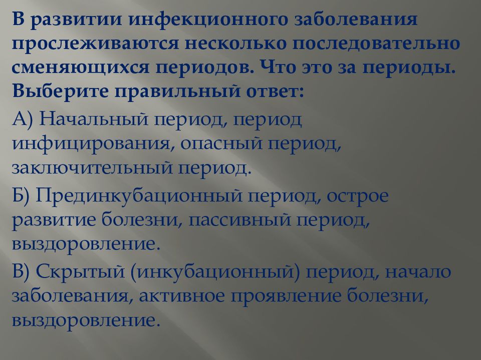 В развитии инфекционного заболевания прослеживаются несколько последовательно сменяющихся периодов. Что это за периоды. Выберите правильный ответ: А) Начальный период, период инфицирования, опасный период, заключительный период. Б) Прединкубационный период, острое развитие болезни, пассивный период, выздоровление. В) Скрытый (инкубационный) период, начало заболевания, активное проявление болезни, выздоровление.