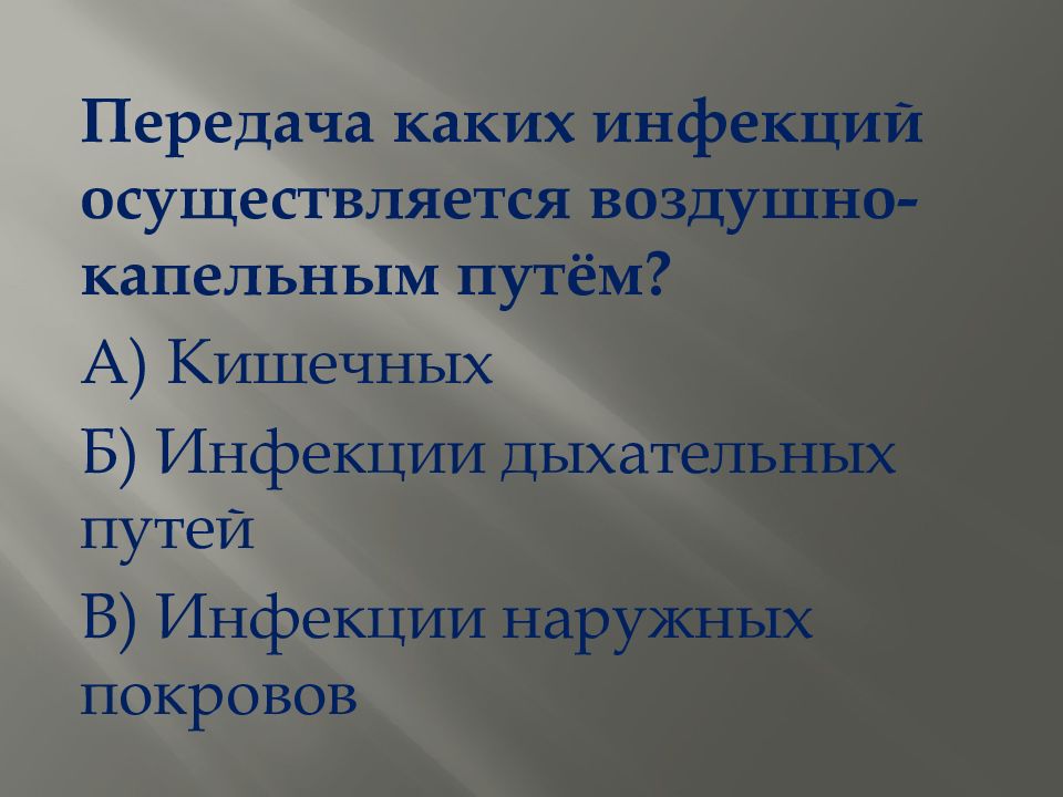 Передача каких инфекций осуществляется воздушно-капельным путём? А ) Кишечных Б) Инфекции дыхательных путей В) Инфекции наружных покровов