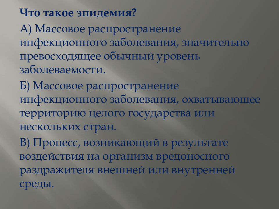 Что такое эпидемия? А ) Массовое распространение инфекционного заболевания, значительно превосходящее обычный уровень заболеваемости. Б) Массовое распространение инфекционного заболевания, охватывающее территорию целого государства или нескольких стран. В) Процесс, возникающий в результате воздействия на организм вредоносного раздражителя внешней или внутренней среды.