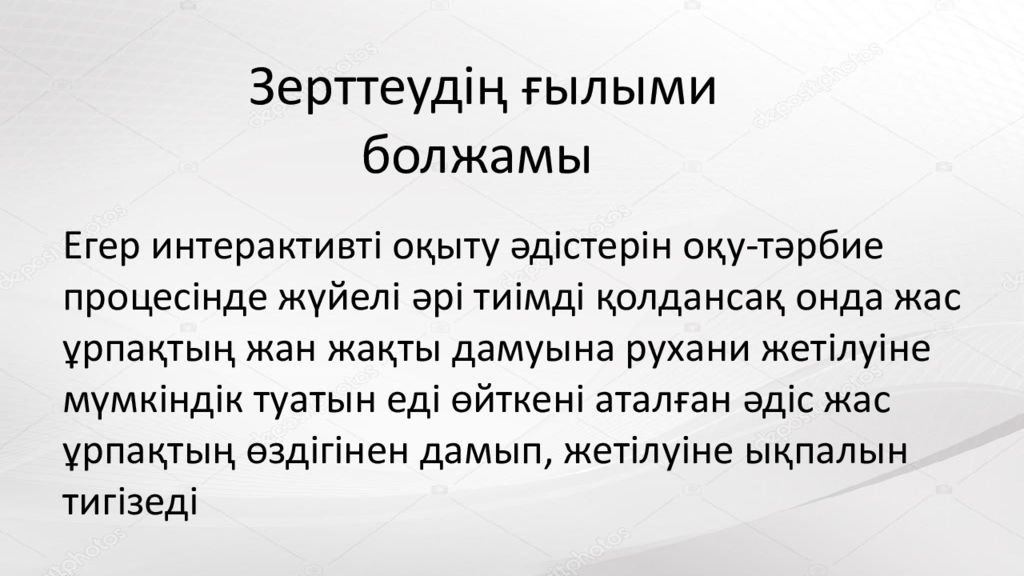 Зерттеудің ғылыми болжамы Егер интерактивті оқыту әдістерін оқу-тәрбие процесінде жүйелі әрі тиімді қолдансақ онда жас ұрпақтың жан жақты дамуына рухани жетілуіне мүмкіндік туатын еді өйткені аталған әдіс жас ұрпақтың өздігінен дамып, жетілуіне ықпалын тигізеді