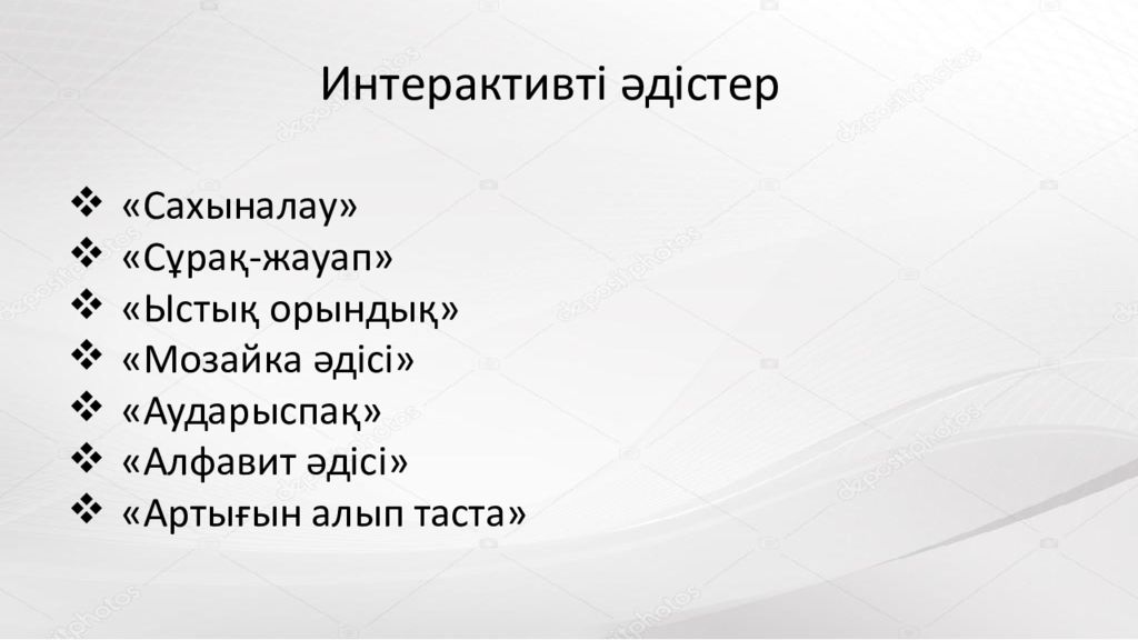 Интерактивті әдістер « Сахыналау » « Сұрақ-жауап » « Ыстық орындық » « Мозайка әдісі » « Аударыспақ » « Алфавит әдісі » « Артығын алып таста »