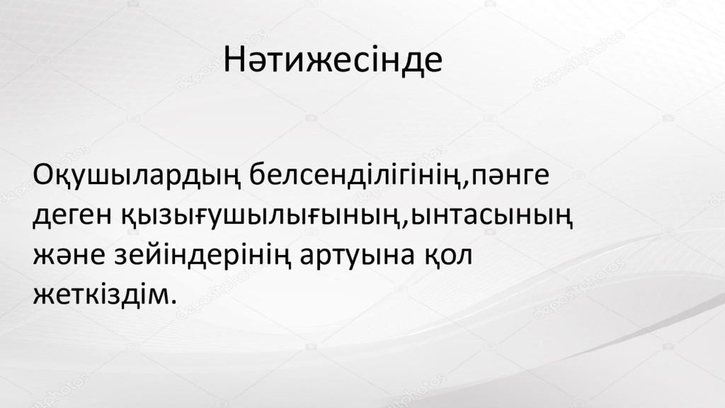 Нәтижесінде Оқушылардың белсенділігінің,пәнге деген қызығушылығының,ынтасының және зейіндерінің артуына қол жеткіздім.